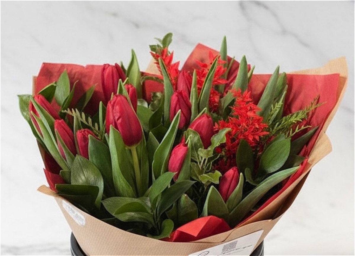 A bouquet of all red tulips and complimentary foliage's in a hand tied style bouquet - This is not delivered in water.