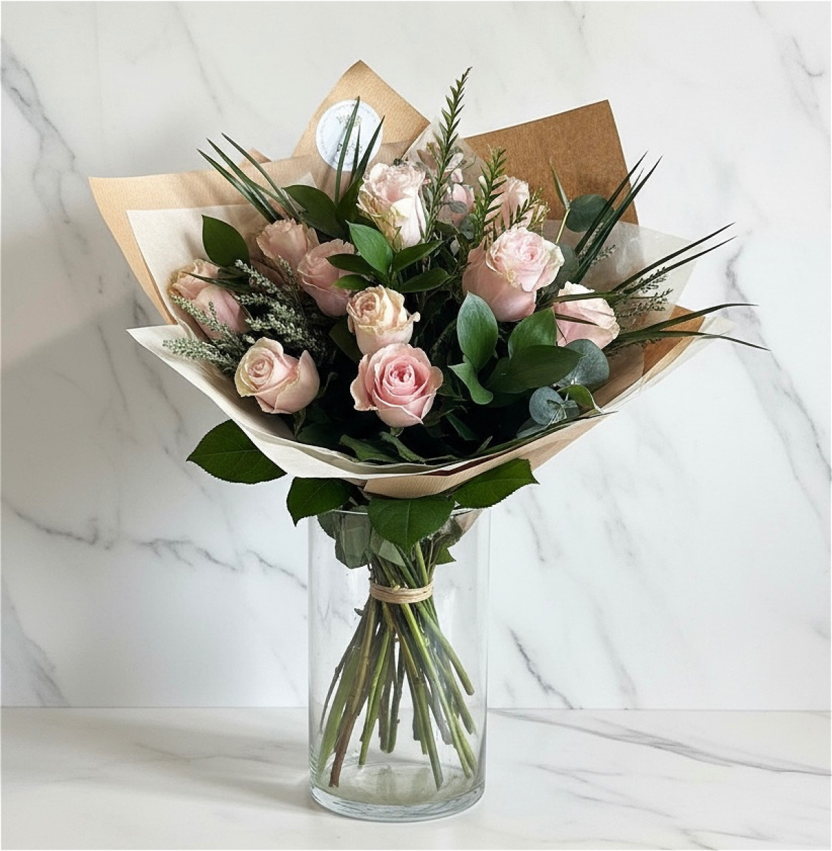 12 x pink long stemmed roses with gorgeous mixed foliages and presented in a glass vase.